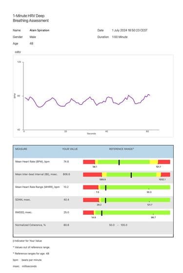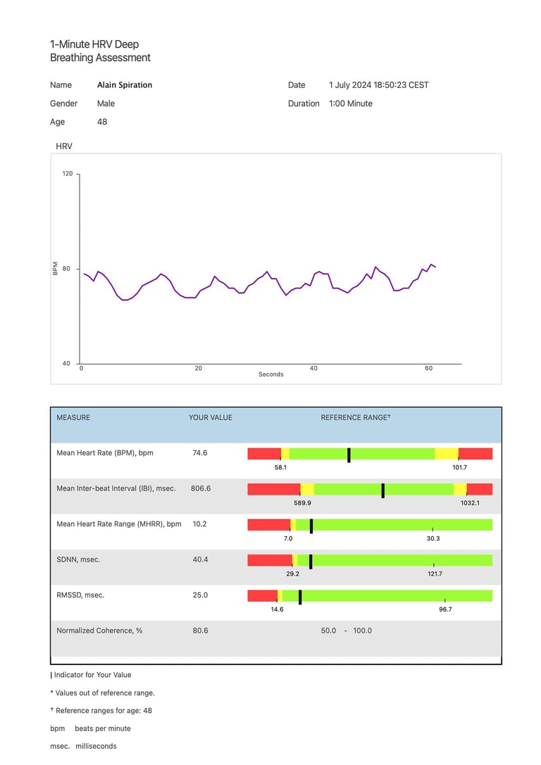 Un rapport détaillé de votre profil respiratoire avec des recommandations pratiques, des exercices sur mesure et un plan d'amélioration progressif. Nous ne vous laissons pas avec des résultats mystérieux : tout est expliqué dans un langage accessible.